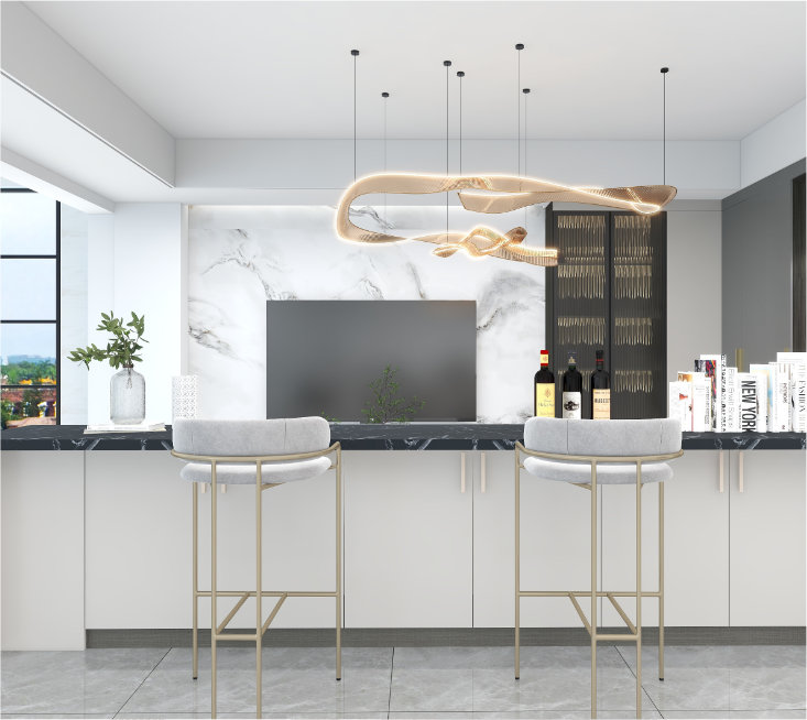 地点:湖南耒阳功能:伟业全案高定前台 洽谈区 客厅客厅用吧台做过渡,配色以黑白灰为主,L型的布艺术沙发、岩纹的电视墙、一字型的地台、条纹的地毯、异形的茶几、轻奢...