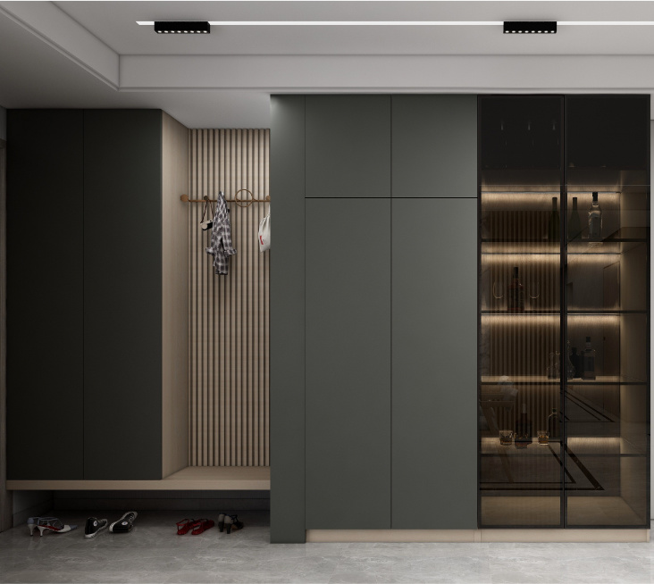 玄关空间设计围绕「进」「出」两个动作传递出不一样的「家之初印象」是凌乱的鞋子?还是有序的收纳?跟着伟业ENF生态板设计,被赞爆啦~ 1、轻奢风从室外转向室内,玄...