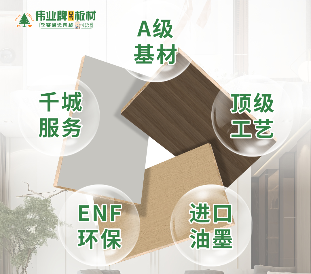 选板材,不止看环保!伟业牌板材用A级基材顶级工艺进口油墨ENF+环保千城服务,重新定义“一块好板”的满分标准! A级原木基材,从源头打造“基因霸权” 好板材,...